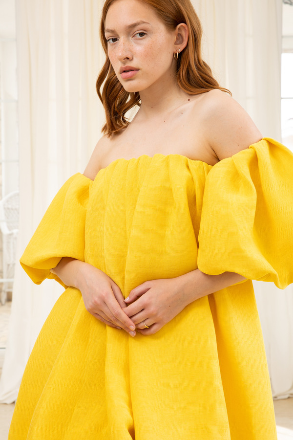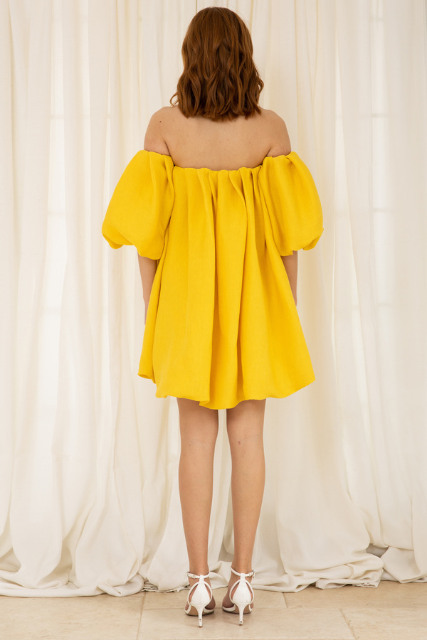 OFF SHOULDER BALLOON MINI VISCOSE DRESS WITH PUFF SLEEVE YELLOW