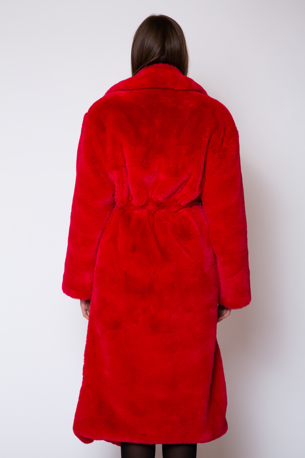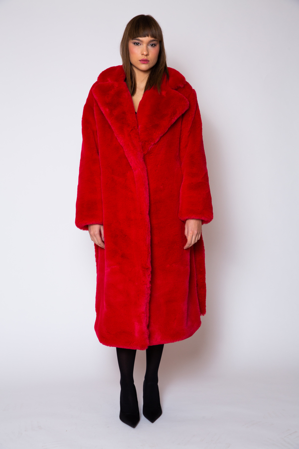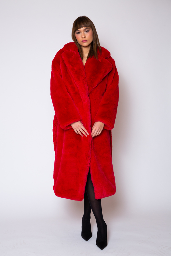 LONG TEDDY COAT WITH LAPEL COLLAR RED