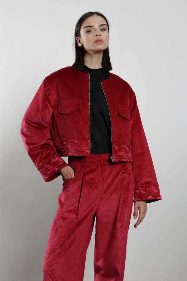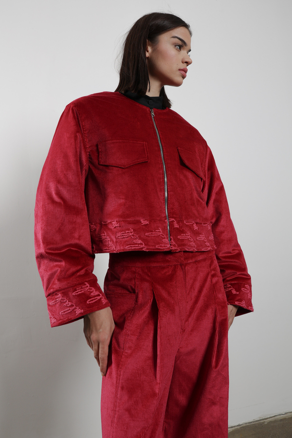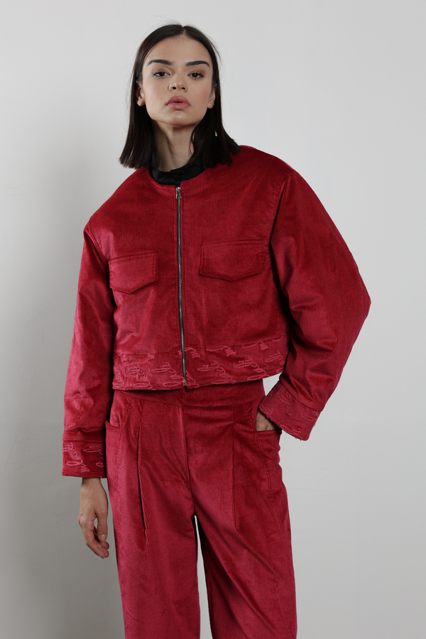 CORDUROY BURGUNDY JACKET WITH MLADI EMBROIDERY DETAILS