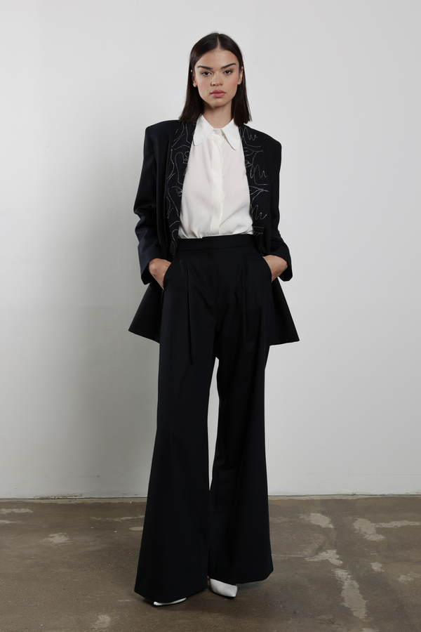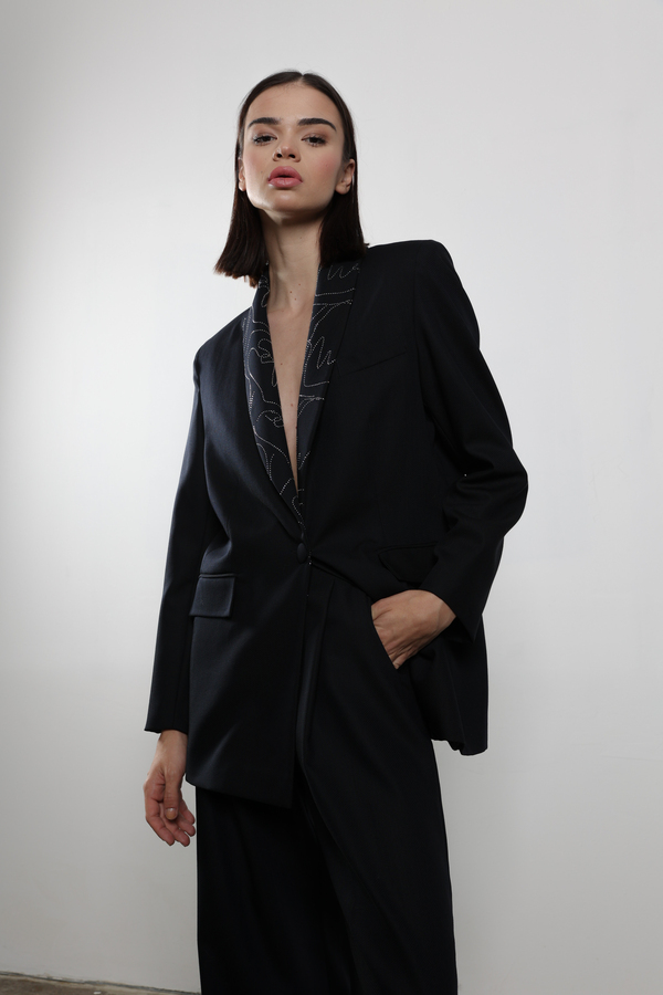 MLADI DARK BLUE SUIT WITH CRYSTAL EMBELLISHED SHAWL LAPEL