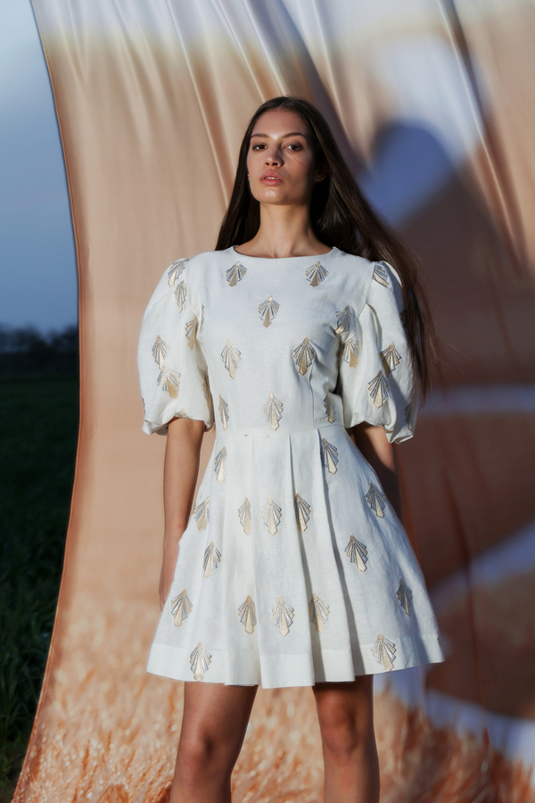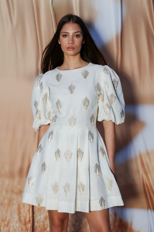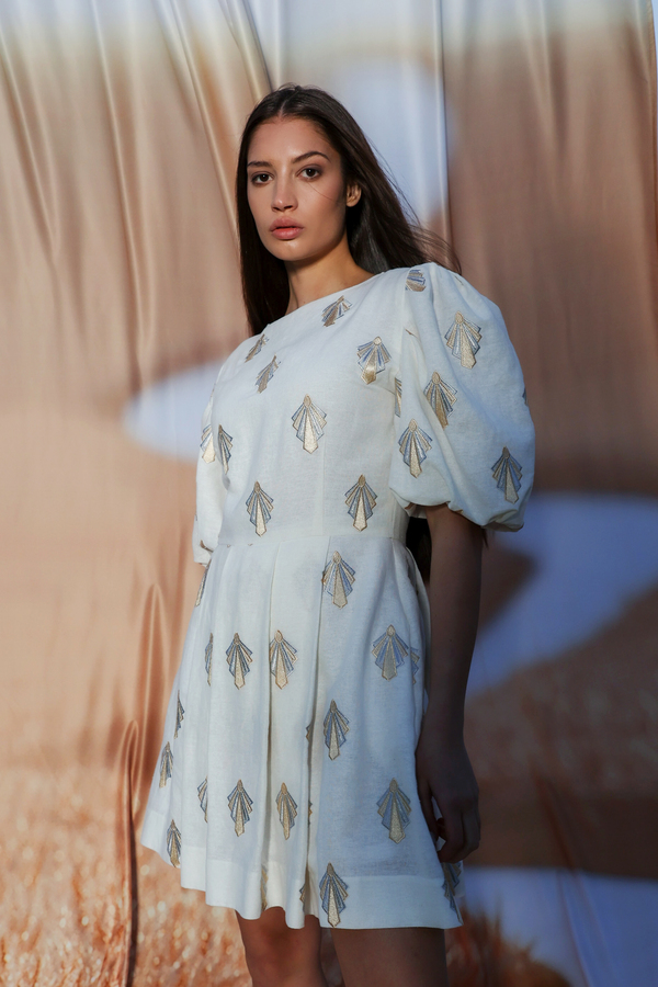 BEIGE SHORT DRESS WITH SILVER-GOLD EMBROIDERY