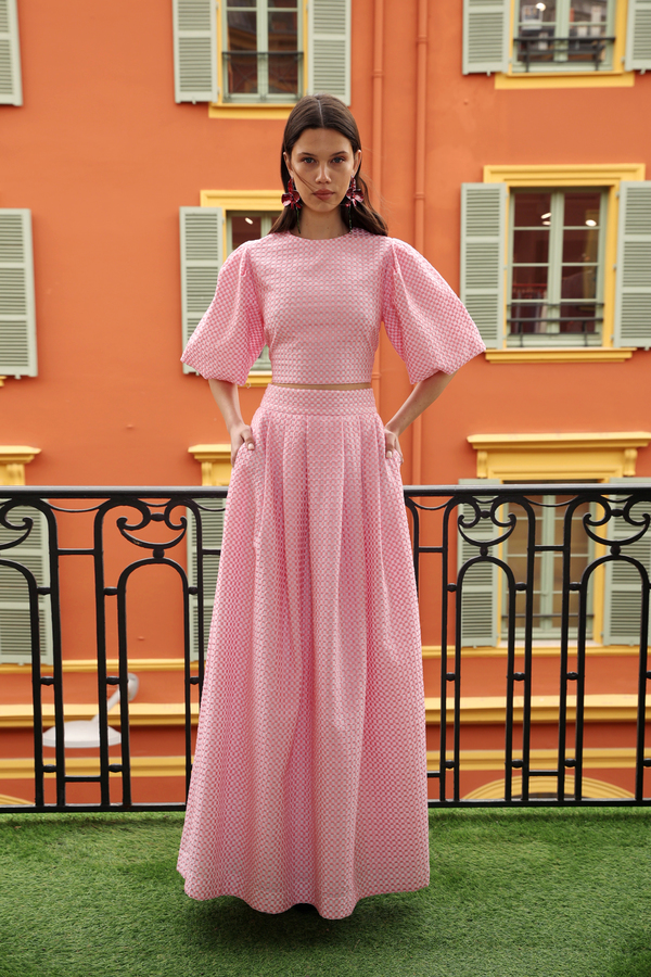 WHITE LONG SKIRT WITH EMBROIDERY PINK SQUARES